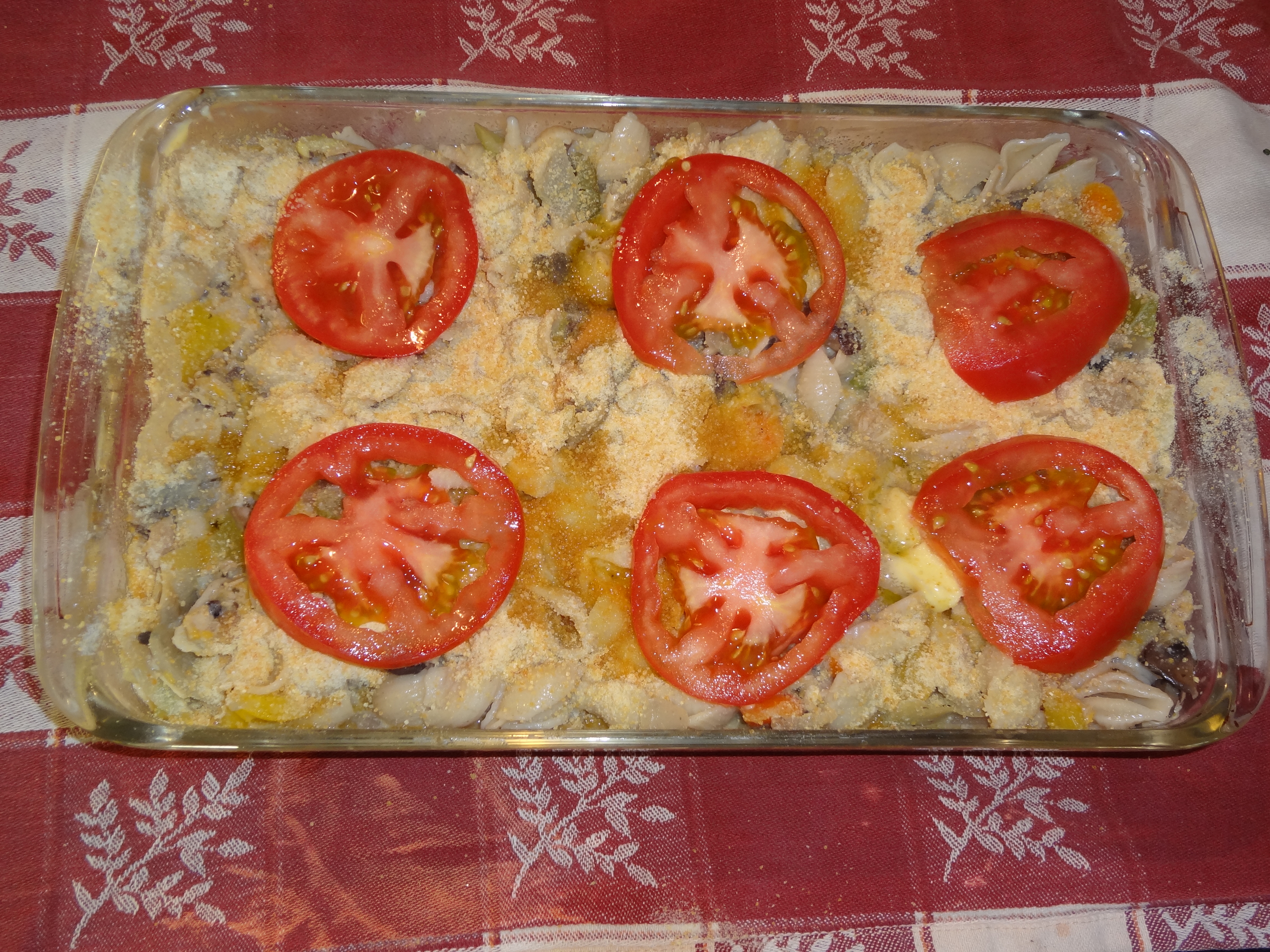 Open the tuna and put in a large bowl, mix in the mushroom soup mixture, add the sautéed vegetables. I drained the pasta and put everything back into the cooled pot because my bowl was overflowing. I added shredded cheese to keep the whole thing sort of held together. I used about a cup or so. Maybe more. Grease a casserole type dish. I used a rectangular Pyrex 11 ish by 7 dish. Dump the mixture into the dish. Think good thoughts and sprinkle with GF bread crumbs or grated parmesan cheese. Add sliced tomatoes to the top because that’s how my husband’s mum does it. Bake for twenty minutes or until it looks bubbly and yummy. For maximum comfort, top with ketchup. I put mine on the side as a dip.