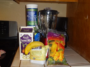 I start with putting 3 tablespoons of oatmeal in the blender and blend because it’s not instant which dissolves better in the smoothie. I then add the flax-seed, banana and the cocoanut milk. Blend before you add the mangos. I take the clear part of the lid off and feed in the mangos. It doesn’t blend as well, not to mention it’s hard on the blender, if it has to blend everything at once. If the mangos are making the mixture to thick, add a little water. When everything is blended, sprinkle in the three tablespoons of vanilla hemp powder. Don’t dump it all in at once or it won’t blend well. Enjoy! This smoothie is great for a midmorning snack when your coffee buzz has worn off. It’s light but filling enough to keep you going without making you sleepy like a full meal.